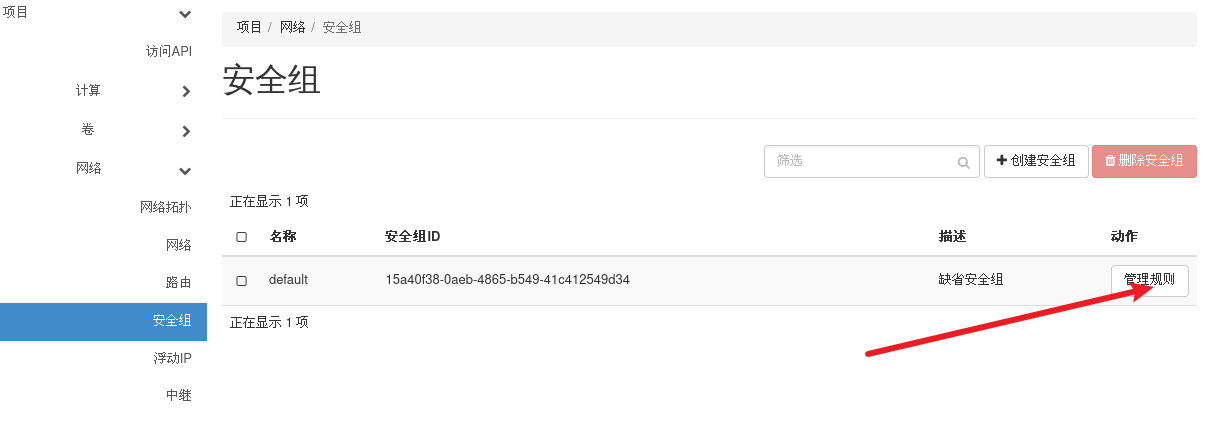 项目管理界面向用户提供计算(云主机)、网络和存储三大类服务,云用户在此集中管理向OpenStack所请求的资源和服务,计算是最常用的,这里列出当前登录用户的计算资源概括,实例指的虚拟机。