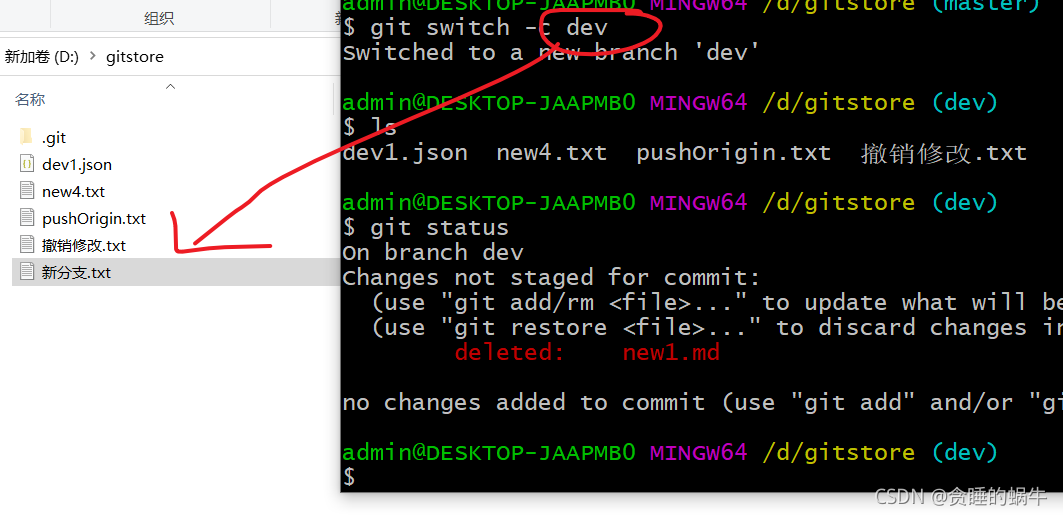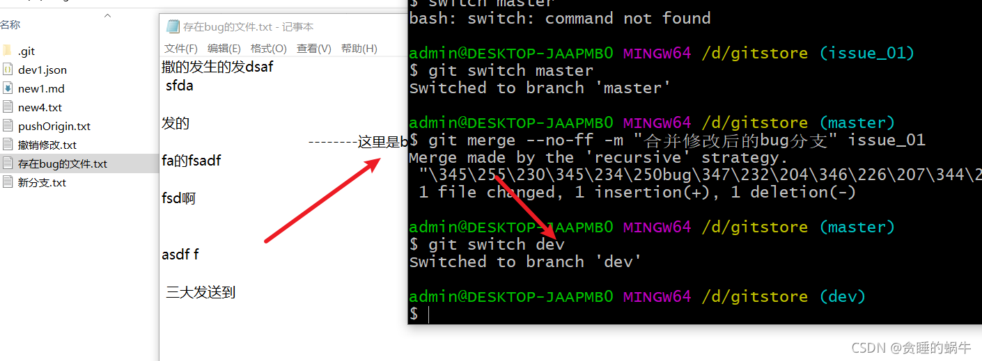 在master新建了一个分支dev,我在dev上增加了一个文件,这时候master出现了一个bug,需要修改。