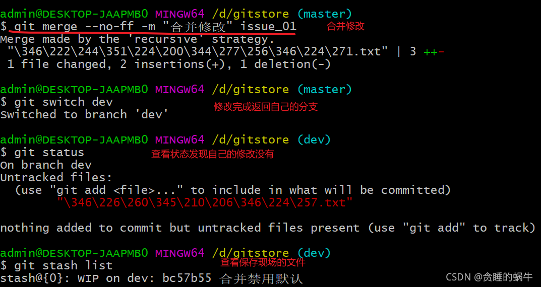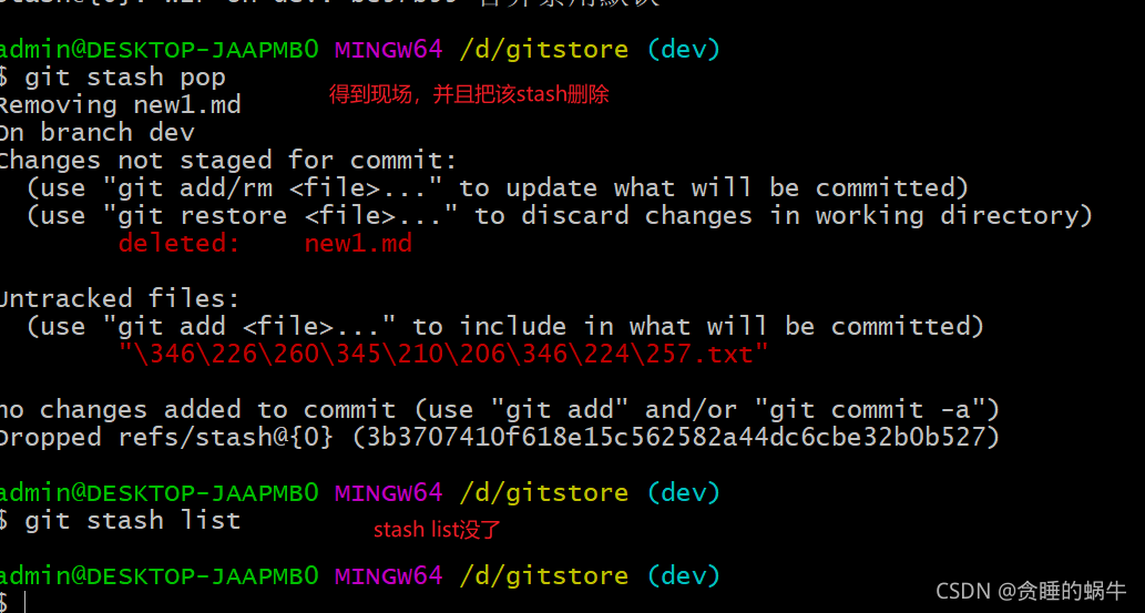 回到自己的分支,git stash list查看保存现场的列表,将最上面的弹出来git stash pop
