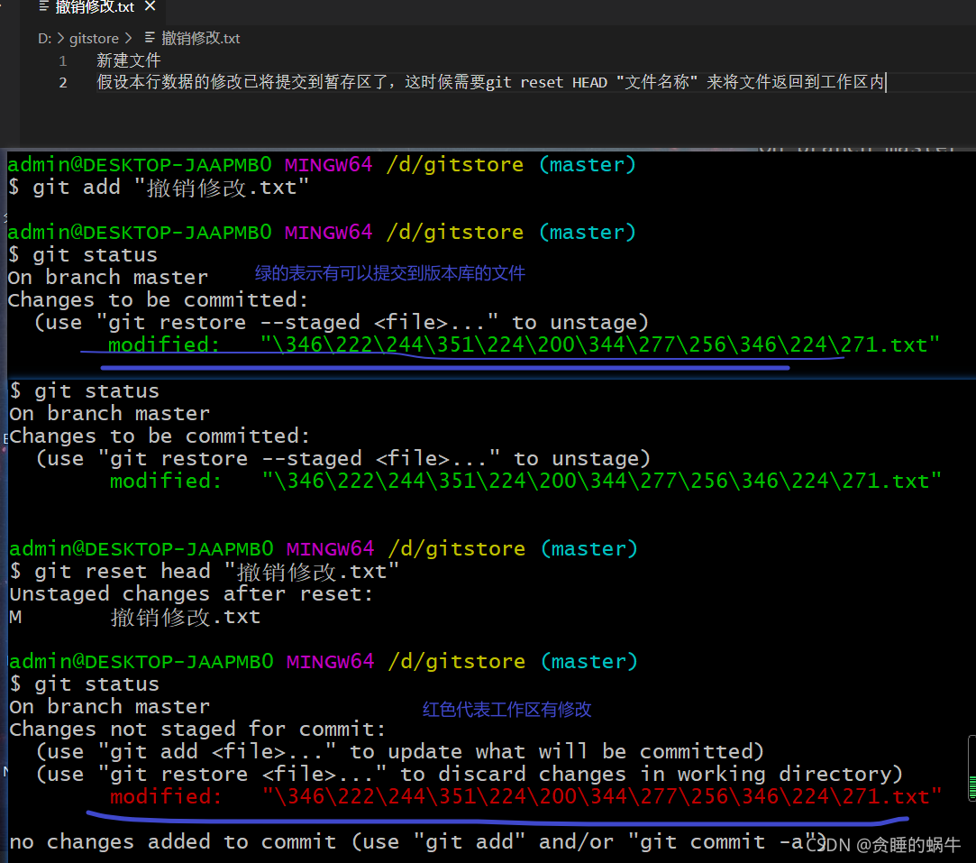 使用git reset head 文件名 将文件回撤到工作区,如果还想撤销使用上述命令