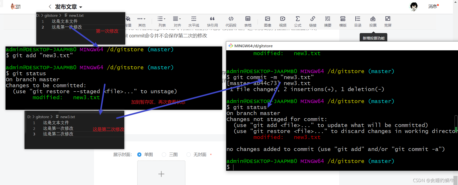 如果修改文件后使用git add命令将工作区的修改放入到暂存区,这时候如果再在工作区里面修改,修改完成后使用git commit命令并不会保存第二次的修改只会保存第一次的修改