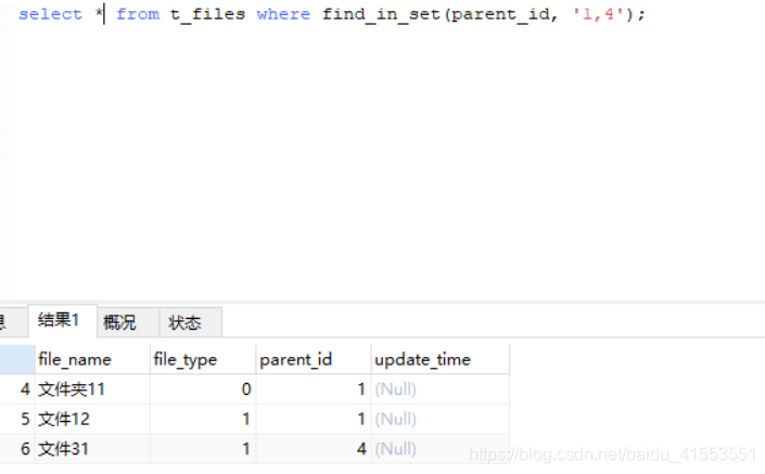 select group_concat(id) as ids from t_files where find_in_set(parent_id, '1,4');