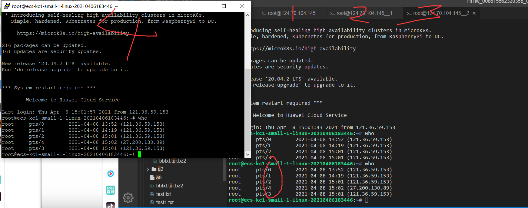 输入who 因为打开了四个中断 所以pts后面显示那几个
