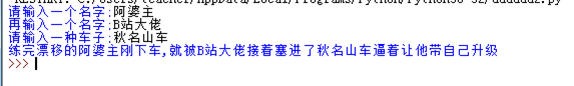 name1 = input('请输入一个名字;') name2 = input('再输入一个名字;') car = input('请输入一种车子;') print('练完漂移的{}刚下车,就被{}接着塞进了{}逼着让他带自己升级'.format(name1,name2,car))