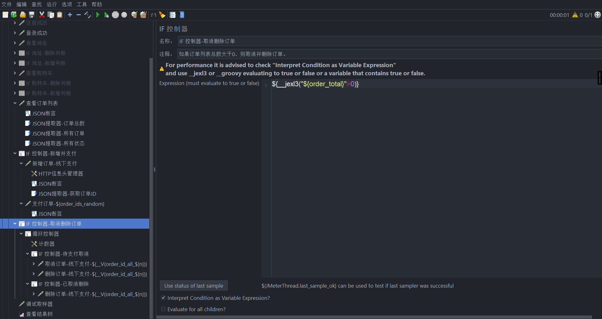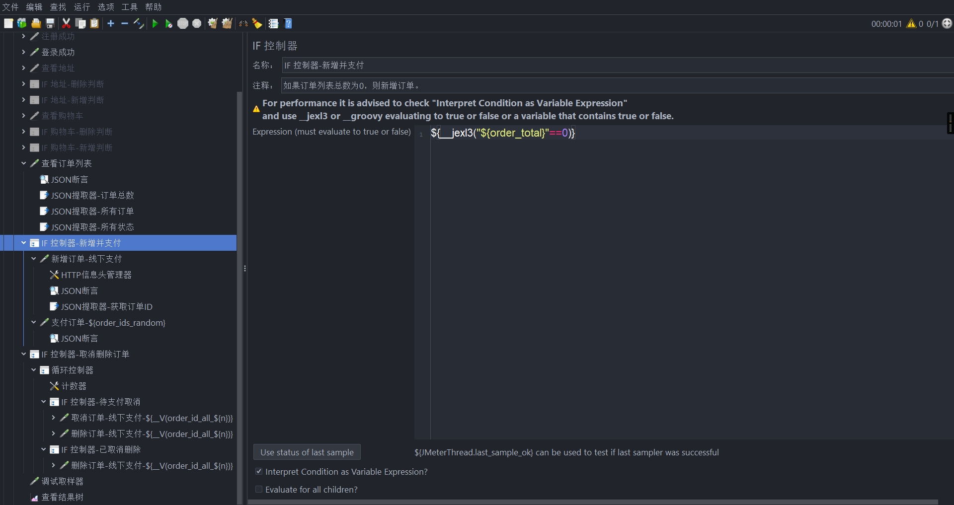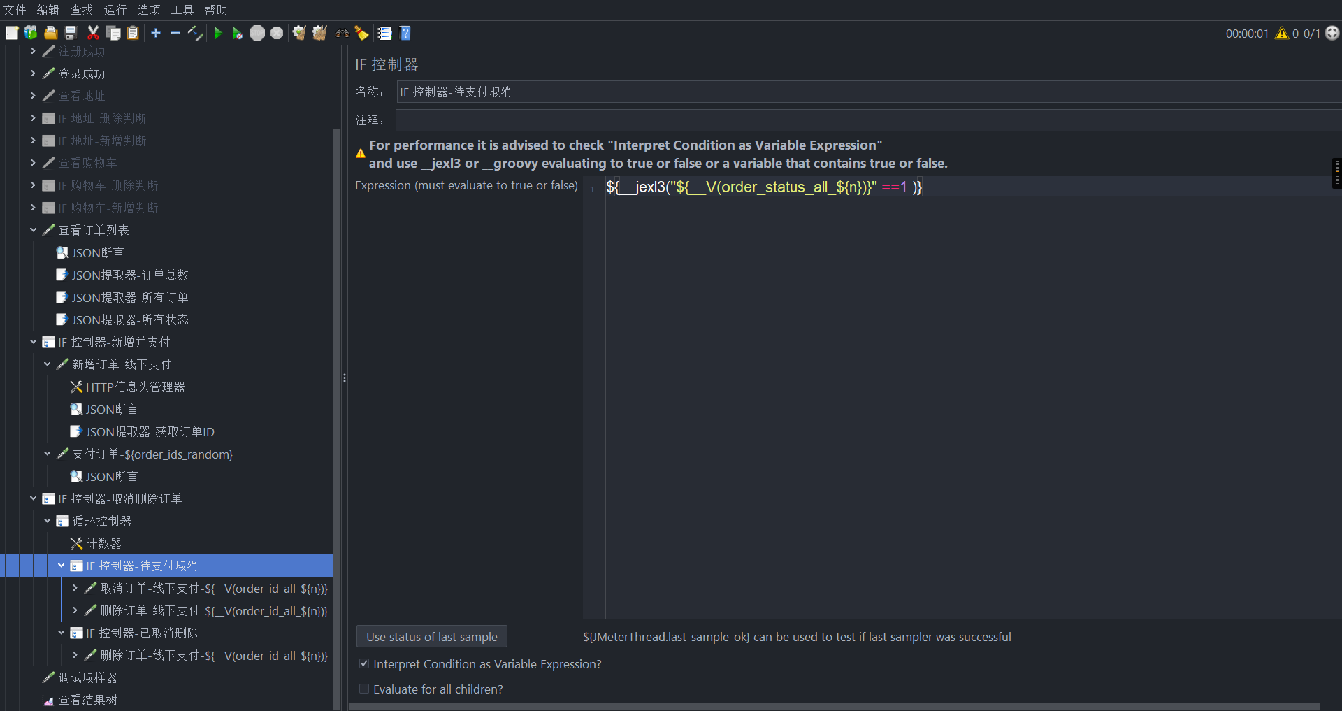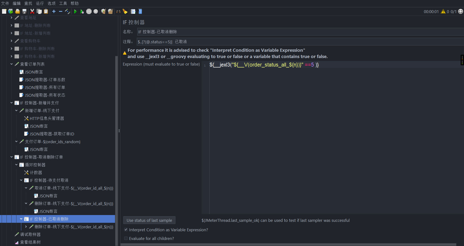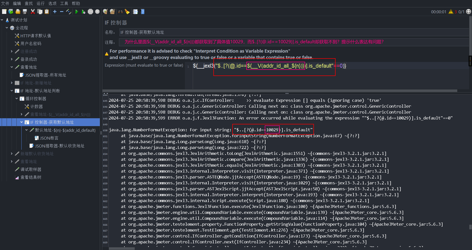 虽然并不能十分确定,但是通过多次(差不多2个多小时)的反复作死,基本上可以确定了,IF控制器的语法不能直接写JSONPath的语法,无论怎么改都会报错,跟正确与否没有关系,它会提示数据语法错误。可以先通过【JSON提取器】把要需要的数据给提取出来,再通过变量来进行判断。截图中数据可以说明,addr_id_all是变量,通过JMeter工具依读取,这里没有问题。但是$..[?(@.id==10029)].is_default这是一个完整的JSONPath语法,正常来说在查看结果树里是可以通过【JSON Path Tester】得出结果,但是【IF控制器】这里却不行。