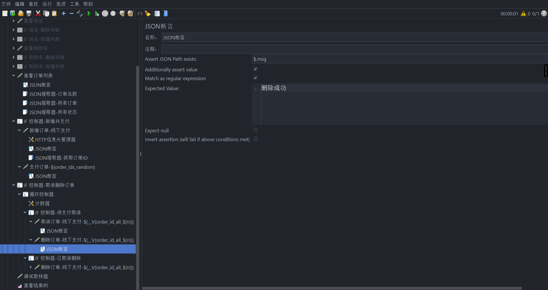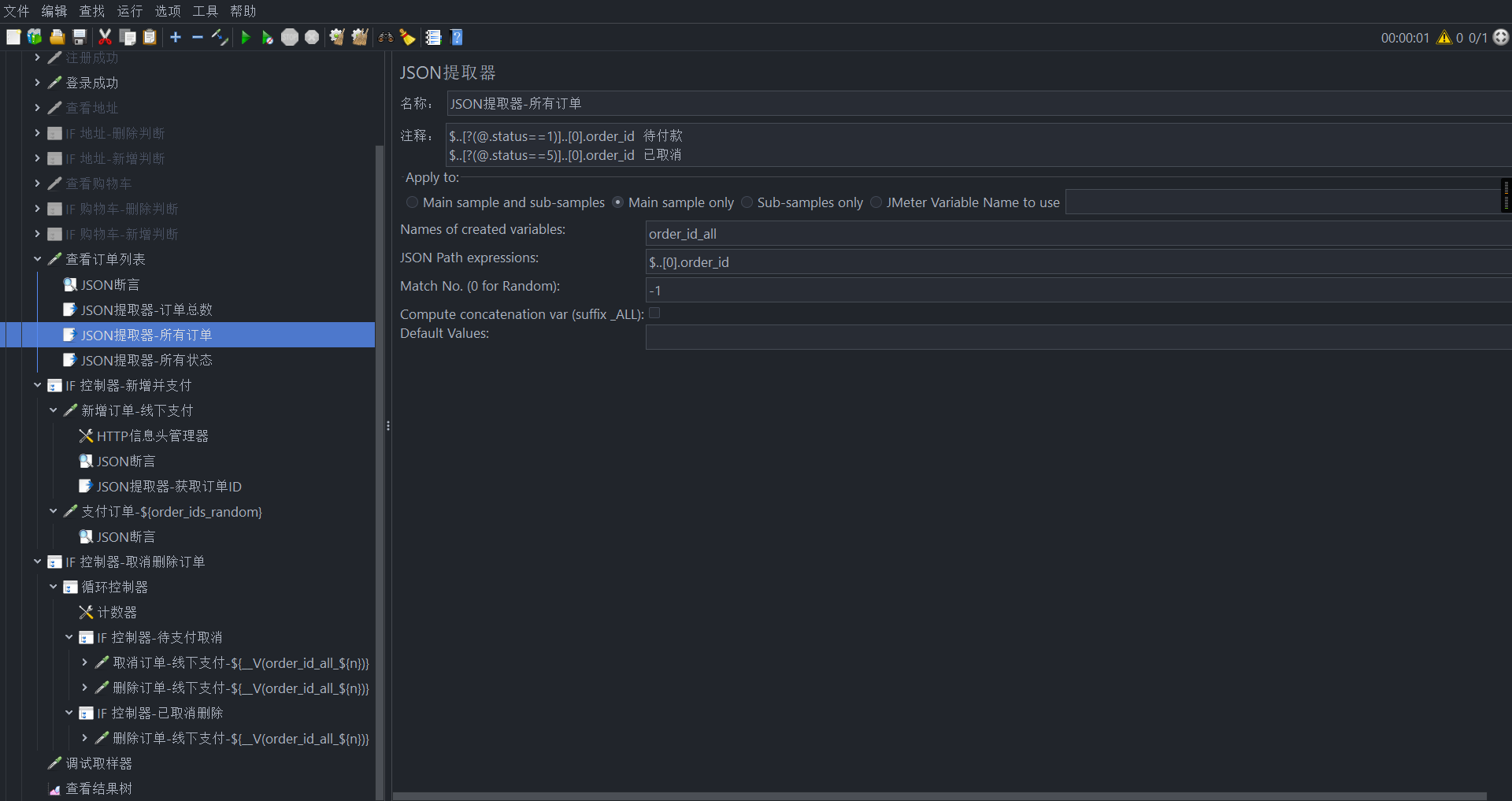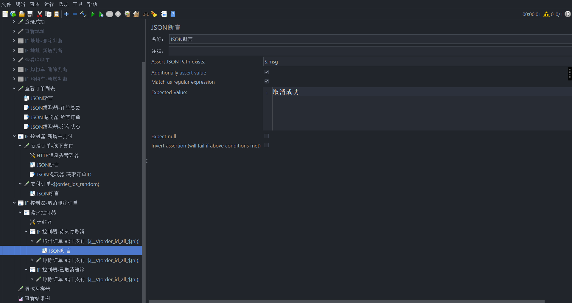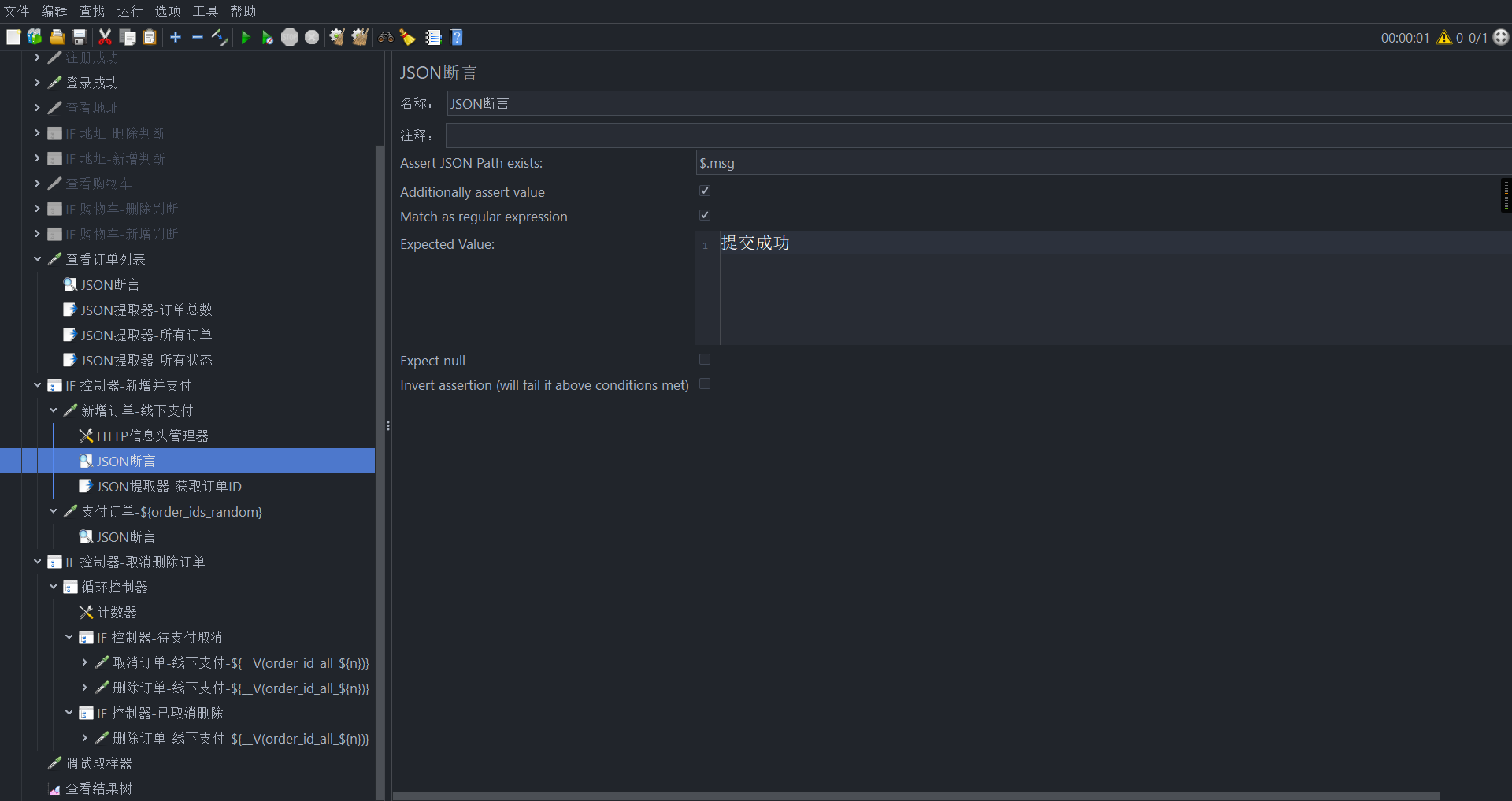 虽然并不能十分确定,但是通过多次(差不多2个多小时)的反复作死,基本上可以确定了,IF控制器的语法不能直接写JSONPath的语法,无论怎么改都会报错,跟正确与否没有关系,它会提示数据语法错误。可以先通过【JSON提取器】把要需要的数据给提取出来,再通过变量来进行判断。截图中数据可以说明,addr_id_all是变量,通过JMeter工具依读取,这里没有问题。但是$..[?(@.id==10029)].is_default这是一个完整的JSONPath语法,正常来说在查看结果树里是可以通过【JSON Path Tester】得出结果,但是【IF控制器】这里却不行。