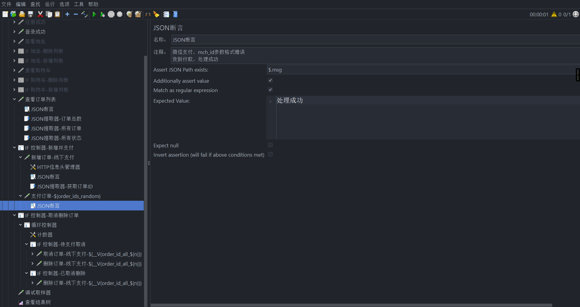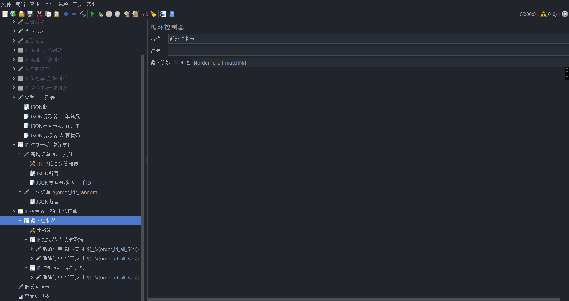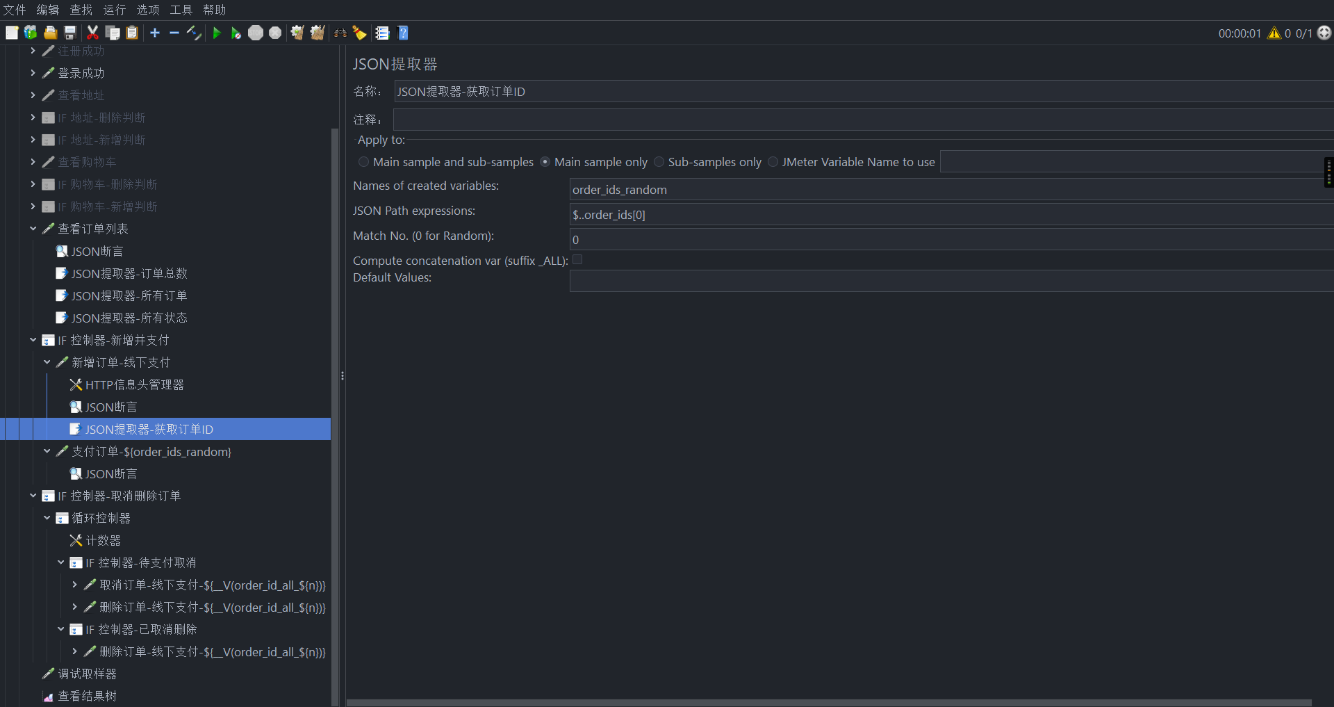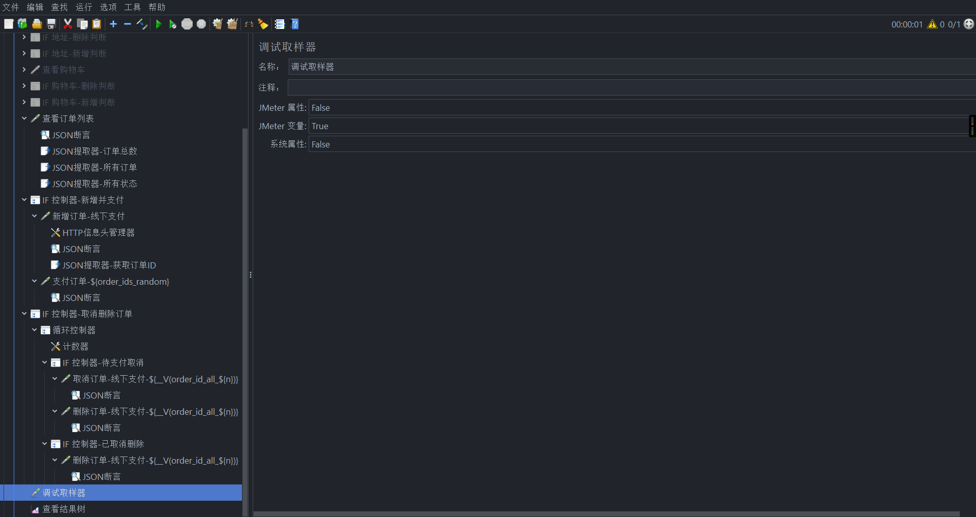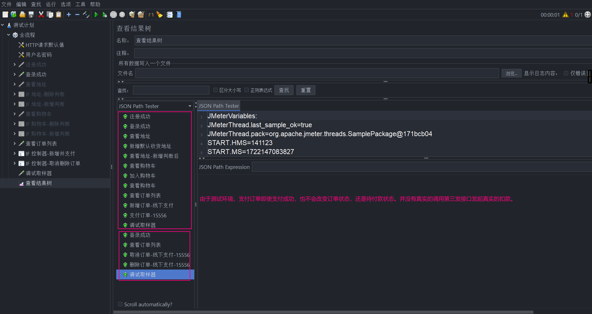 虽然并不能十分确定,但是通过多次(差不多2个多小时)的反复作死,基本上可以确定了,IF控制器的语法不能直接写JSONPath的语法,无论怎么改都会报错,跟正确与否没有关系,它会提示数据语法错误。可以先通过【JSON提取器】把要需要的数据给提取出来,再通过变量来进行判断。截图中数据可以说明,addr_id_all是变量,通过JMeter工具依读取,这里没有问题。但是$..[?(@.id==10029)].is_default这是一个完整的JSONPath语法,正常来说在查看结果树里是可以通过【JSON Path Tester】得出结果,但是【IF控制器】这里却不行。