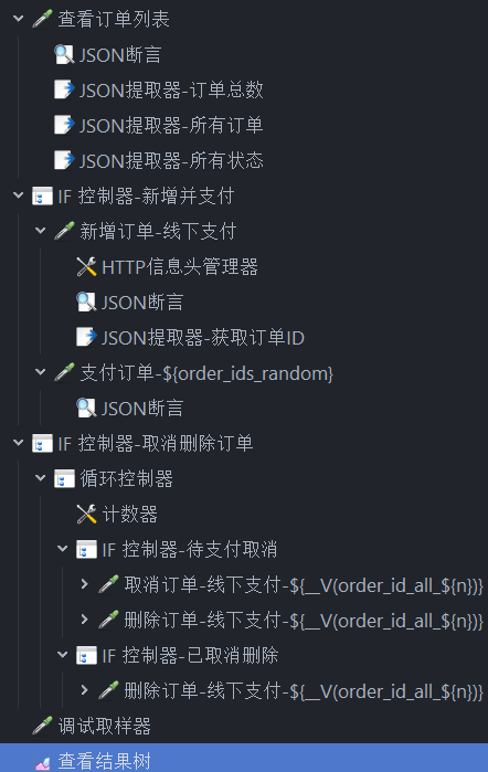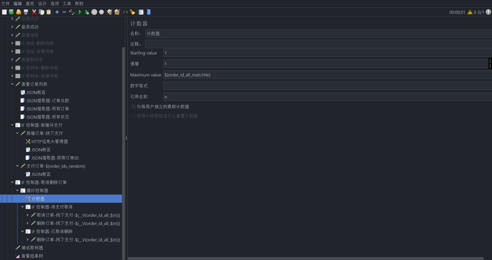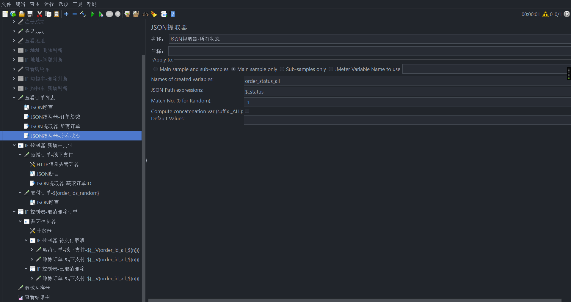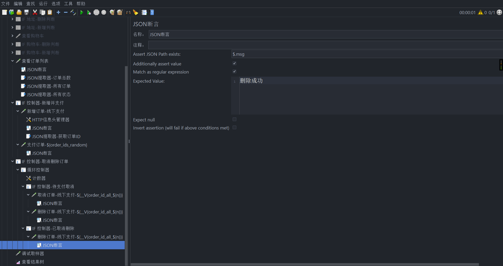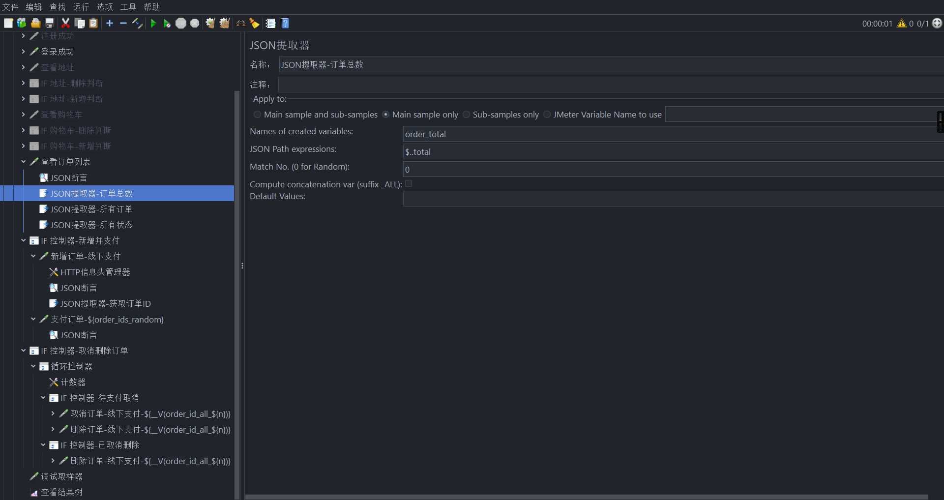 虽然并不能十分确定,但是通过多次(差不多2个多小时)的反复作死,基本上可以确定了,IF控制器的语法不能直接写JSONPath的语法,无论怎么改都会报错,跟正确与否没有关系,它会提示数据语法错误。可以先通过【JSON提取器】把要需要的数据给提取出来,再通过变量来进行判断。截图中数据可以说明,addr_id_all是变量,通过JMeter工具依读取,这里没有问题。但是$..[?(@.id==10029)].is_default这是一个完整的JSONPath语法,正常来说在查看结果树里是可以通过【JSON Path Tester】得出结果,但是【IF控制器】这里却不行。