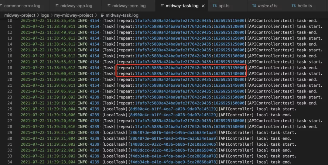 logger.info(`task start.`) // 异常情况: logger.error(`${e.stack}`) logger.info(`task end.`)