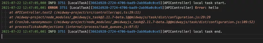 logger.info(`local task start.`) // 异常情况: // logger.error(`${e.stack}`) logger.info(`local task end.`)