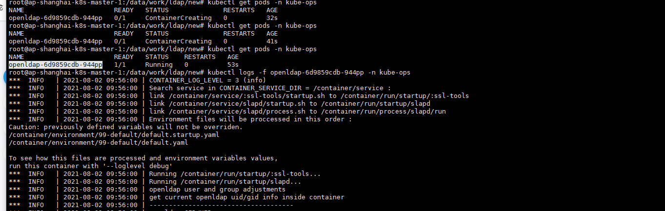 kubectl logs -f openldap-6d9859cdb-944pp -n kube-ops