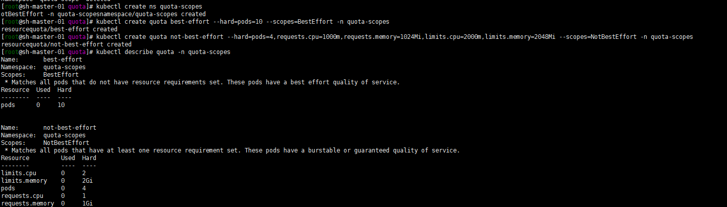 创建一个quota-scopes的命名空间,并创建一个名为best-effort的 ResourceQuota,一个名为not-best-effort的 ResourceQuota: