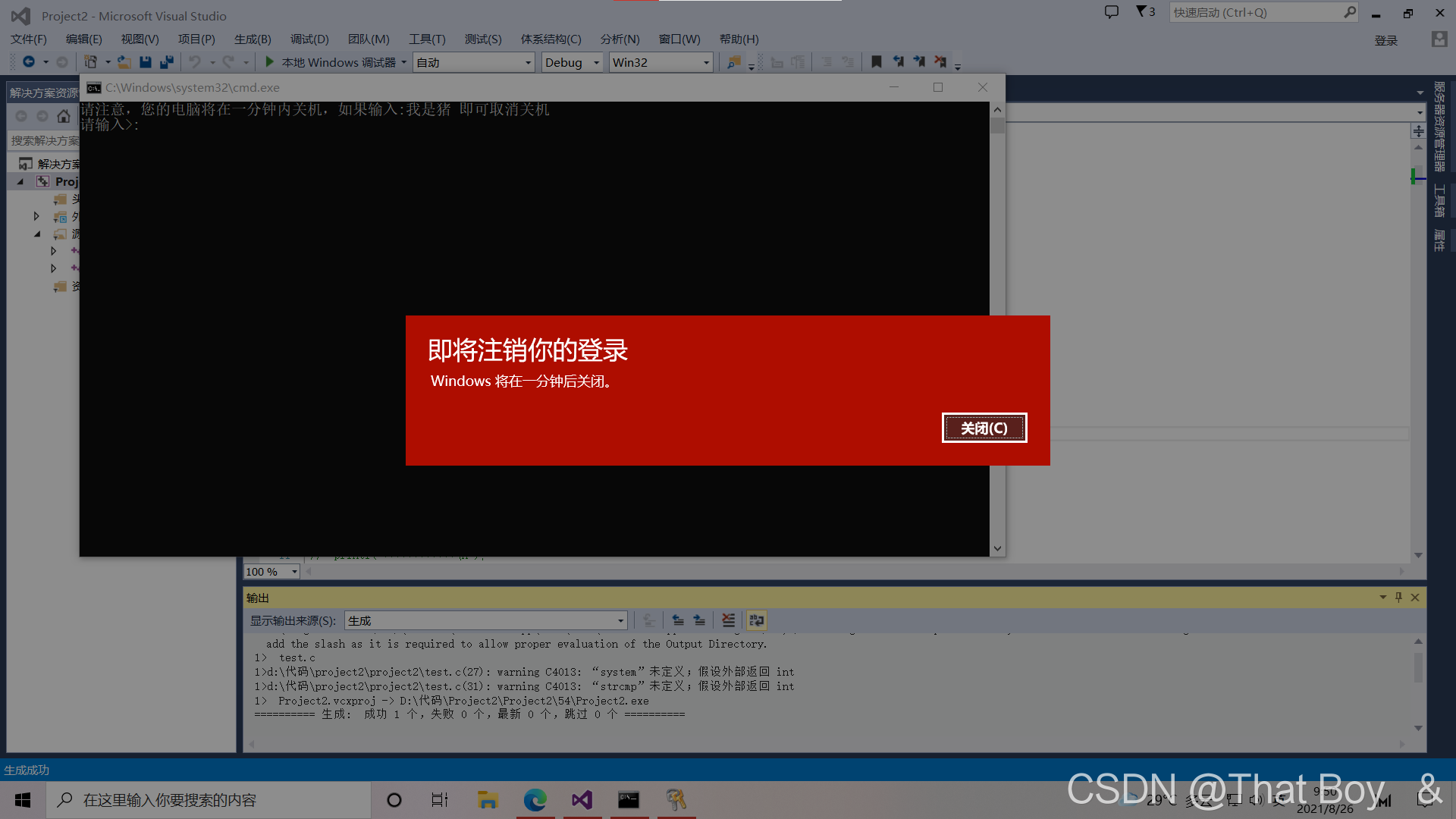 printf("请注意,您的电脑将在一分钟内关机,如果输入:我是猪 即可取消关机\n请输入>:");