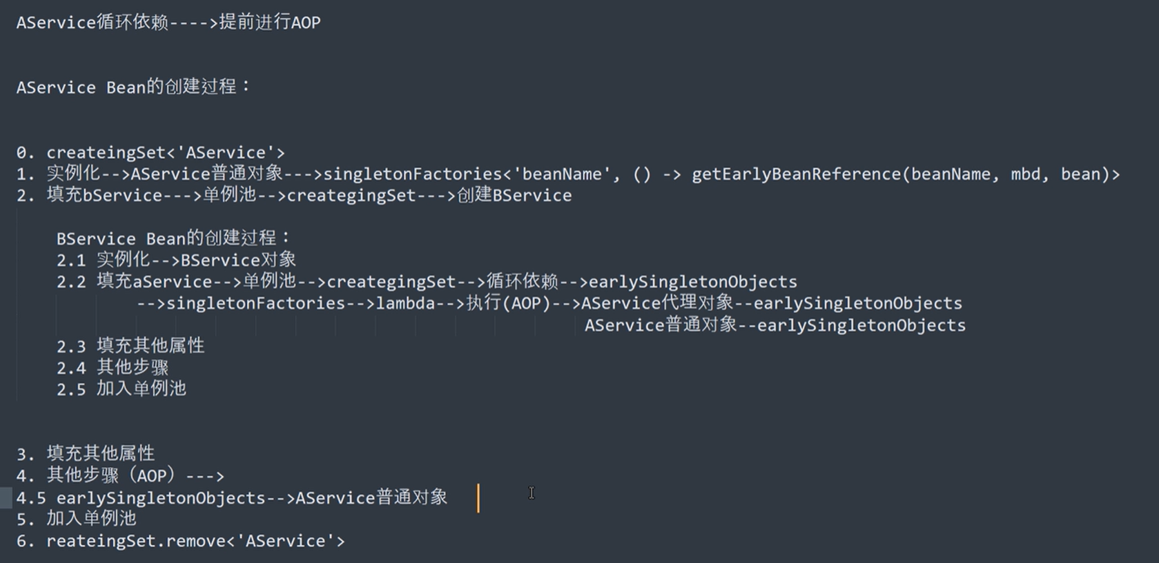 然后开始填充b属性,先去单例池中寻找是否存在B的对象,如果不存在,在去createingSet寻找B,判断是否出现循环依赖,不存在则是实例化一个B的普通对象,将生成B普通对象存入三级缓存,填充a属性时也是先去单例池中寻找,找不到再去createingSet中寻找,发现此时有A,则是出现了循环依赖,然后再去earlySingletonObjects(二级缓存)中寻找A对象,如果没有,则再去singletonFactories(三级缓存)中寻找,此时存在A对象,则将A对象拿出来,并执行lambda表达式判断是否需要进行aop,如果需要则初始化A的代理对象存入earlySingletonObjects(二级缓存)中,如果不需要则初始化一个普通对象存入earlySingletonObjects(二级缓存)中,然后填充B中的A属性,再填充A中的B属性。此时发现两个缓存就可以了