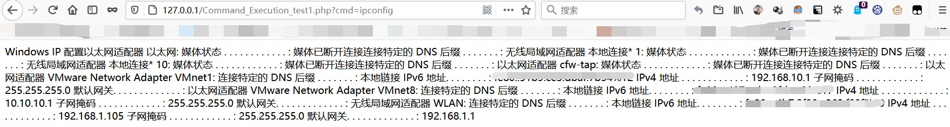 构造参数http://127.0.0.1/Command_Execution_test1.php?cmd=ipconfig,有: