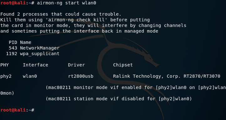 3、无线网卡切换为监听模式:airmon-ng start wlan0