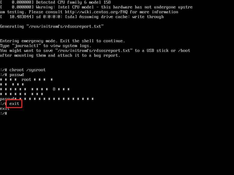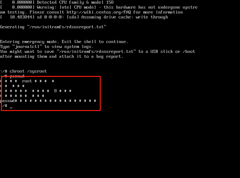 4、进入紧急模式,mount -o remount,rw /sysroot,回车,chroot /sysroot回车,系统提供sh-4.2#提示符