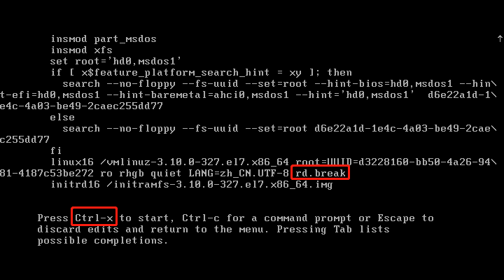 2、在LANG= \ zh_CN.UTF-8后面输入 rd.break