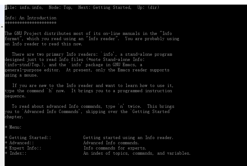 Node:代表目前的这个页面是属于Top节点。 意思是info.info内含有很多信息,而Top仅是info.info文 件内的一个节点内容而已;