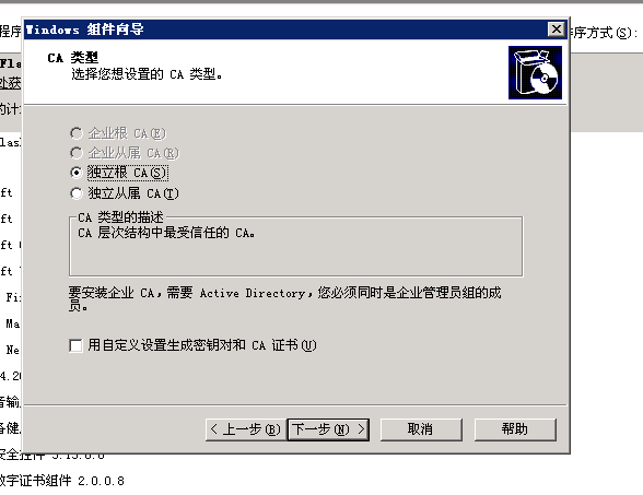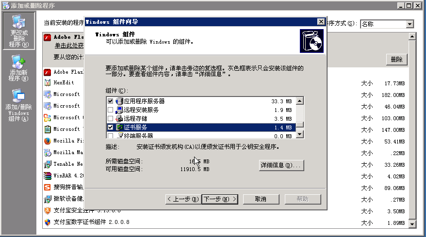 依次点击:“添加删除windows组件”,在组件向导中选中“应用程序服务器”与“证书服务”,先不要点击下一步: