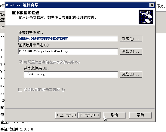 下一步后,会出现证书数据库的相关设置,不用修改,继续下一步