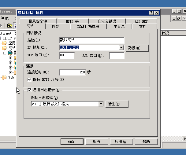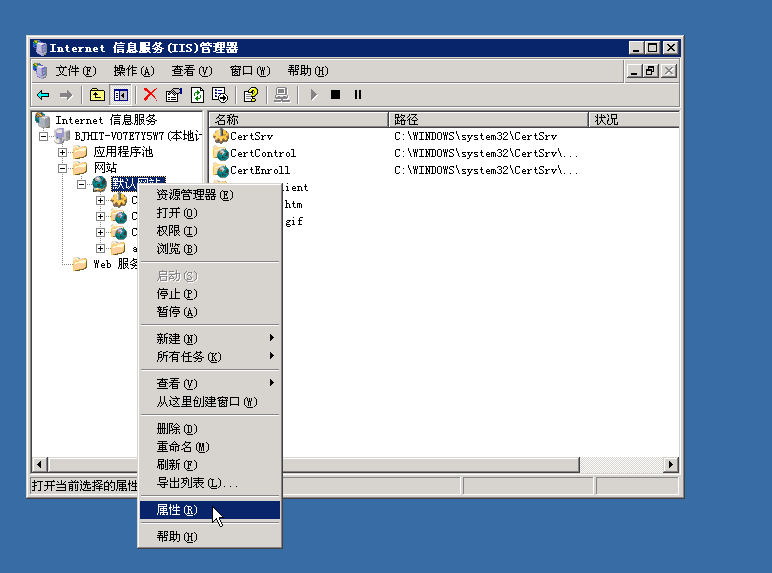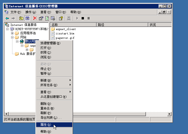 安装完成后,打开IIS,右键“默认网站”,选择“属性”