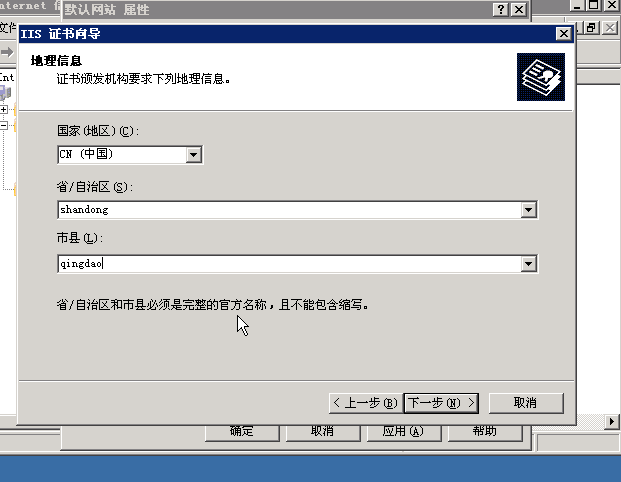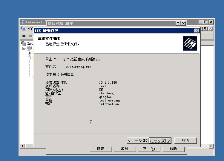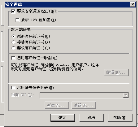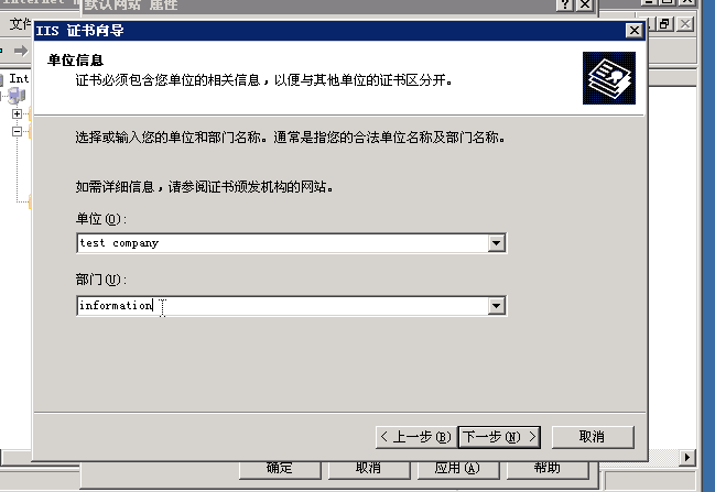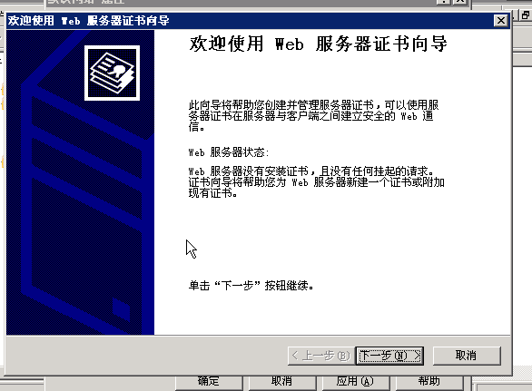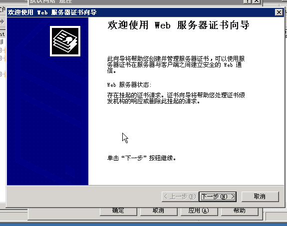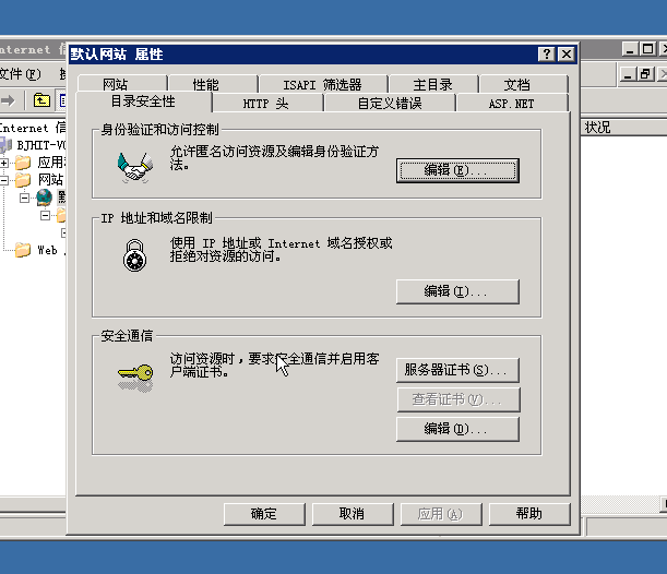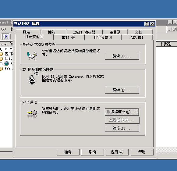 再进入到默认网站属性,选择“目录安全性”,单击“服务器证书”: