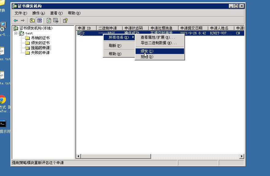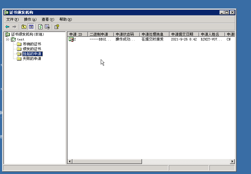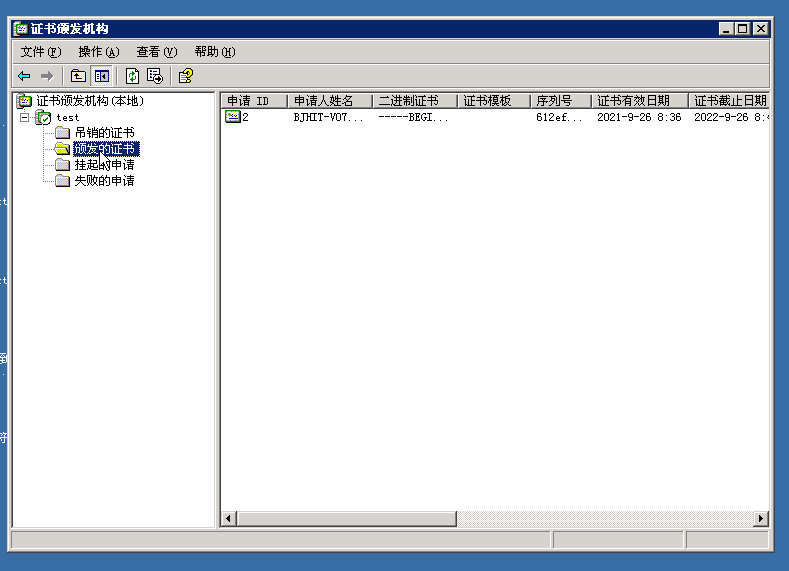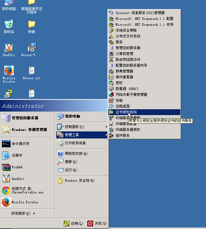 证书的颁发在证书服务器中操作,接下来的操作是证书审核员的角色,切换到CA服务器,点击“开始”>>“管理工具”>>“证书颁发机构”: