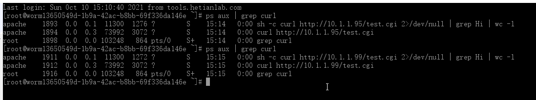 登录Worm1(10.1.1.12),不断的执行命令:“ps aux |grep curl”可以看到蠕虫的传播过程,被感染的Worm1通过agent.1337进程,不断的向同网段的其他主机发起攻击与感染。