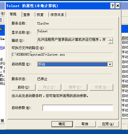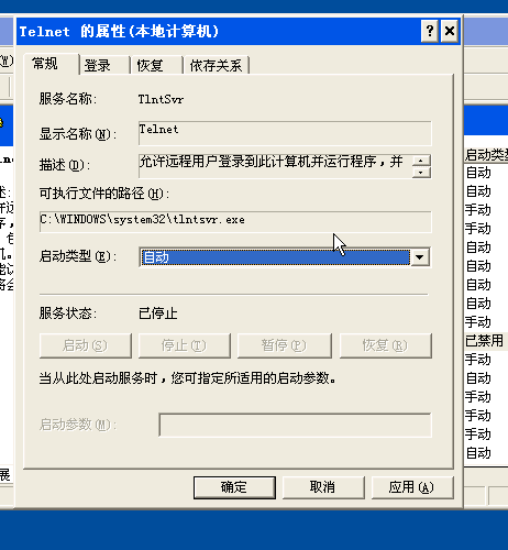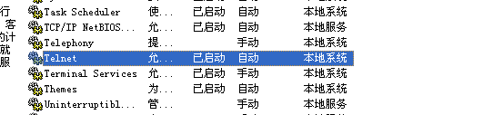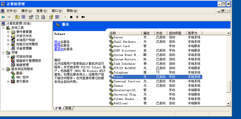 进入主机A,右键“我的电脑”->管理->服务和应用程序->服务,找到Telnet服务