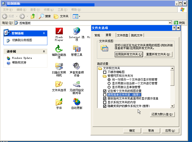 (2)在主机B的“控制面板-工具-文件夹选项-查看-简单的文件共享”去掉选取。
