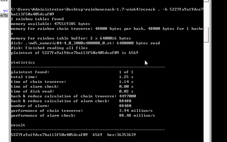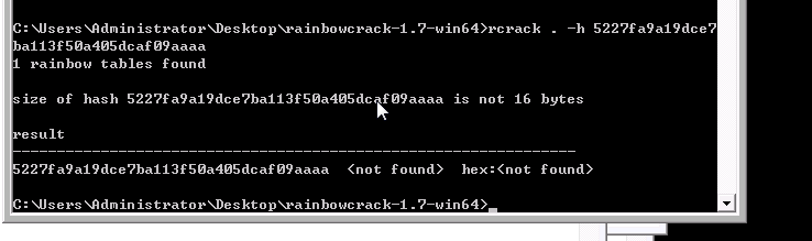 对于单个的哈希值,我们可以直接用rcrack.exe . -h hashnum来进行破解:
