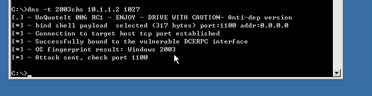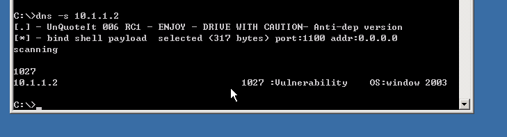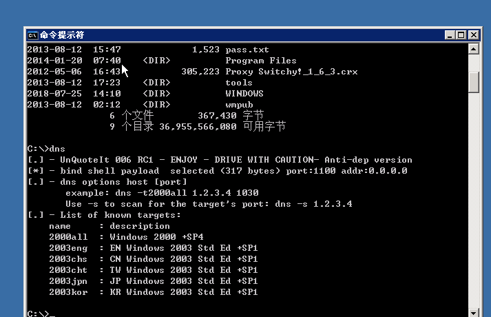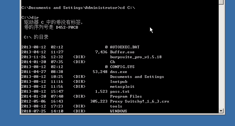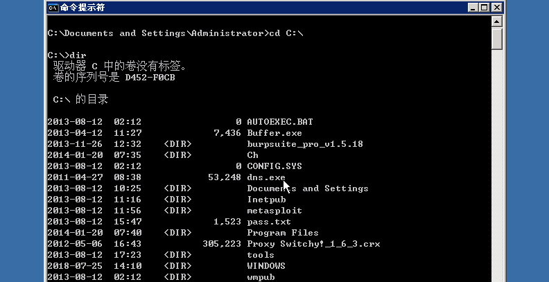 在cmd下切换到C:\目录下,查看该目录下的文件,可以看到有个文件dns.exe,这个文件即是我们本次实验的溢出工具。