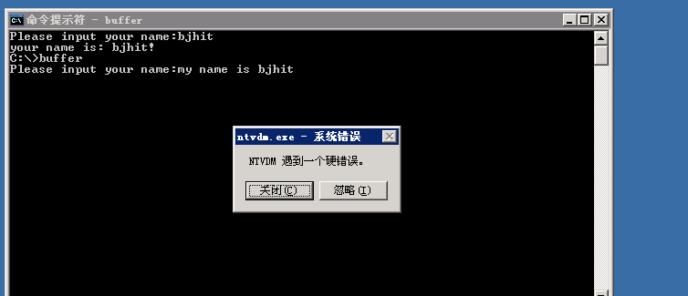 在提示符下输入buffer运行程序,输入bjhit,发现程序正常运行