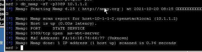 在msf>提示符下输入命令:db_nmap -sT -p3389 10.1.1.2, 收集目标主机信息,并对返回的信息进行分析。