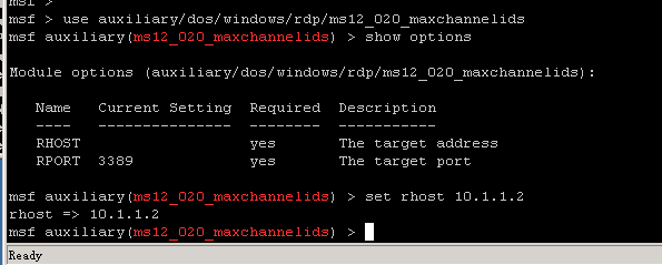 输入use auxiliary/dos/windows/rdp/ms12_020_maxchannelids命令,并设置相关的参数
