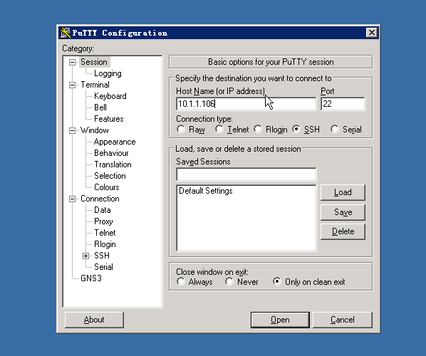登录实验机后,打开桌面上的putty程序,输入10.1.1.106,再点击Open.。