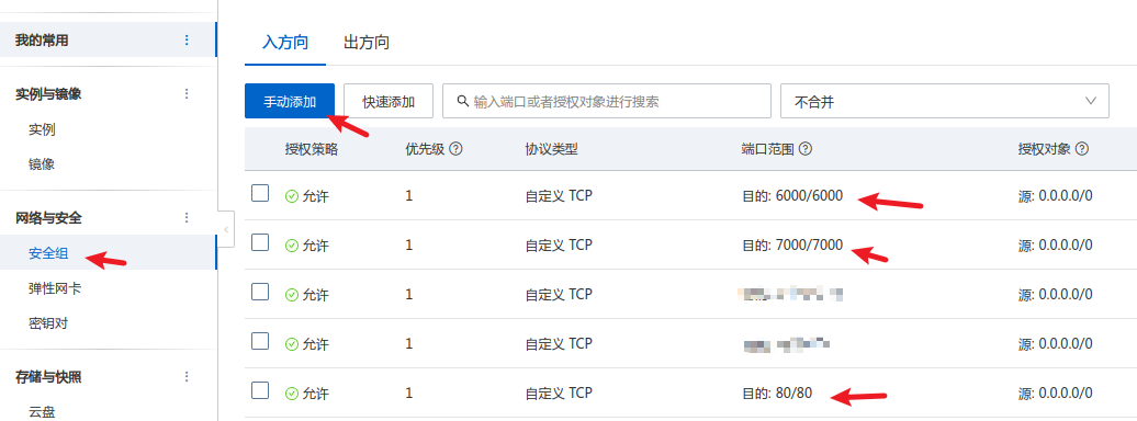 阿里云安全组放开端口权限,目前就6000、7000、80三个端口用到了,这边就开发这三个端口