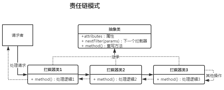 行为型模式,让一个请求通过一系列的对象组成的链,解耦请求者和接收者;下图中的抽象类也可以是接口,在抽象类中可以保持下一个拦截器的引用。在接口中,可以使用一个专门的拦截器链类通过集合的方式持有所有的拦截器实例,之后依次遍历集合中的元素来完成对应的操作。本文的代码使用接口的方法。
