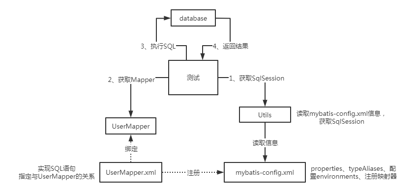 经过上述操作sqlSessionFactory中应该保存了mybatis-config.xml中的信息。而与获取SqlSession有关的sqlSessionFactory.openSession()应该是与数据库建立了会话,其中的逻辑应该是利用sqlSessionFactory保存的数据库连接信息与数据库建立了连接,此时已经有了执行SQL语句的条件。要执行SQL语句,就需要先获取到SQL语句,此时我们知道的信息有:UserMapper.xml注册到了mybatis-config.xml中,sqlSessionFactory中应该有映射器的信息。而在第二步时,SqlSession执行了getMapper()获取到了UserMapper实例。猜想是UserMapper是一个接口,UserMapper.xml绑定了UserMapper,在注册时相当于注册了UserMapper的信息,通过接口获取一个UserMapper的实例,内部可能用到了动态代理来获得实例。此时通过解析UserMapper.xml中的SQL语句,并将产生的实例与之绑定,此时我们就有了用户实例、SQL语句,还有已经打开的数据库连接,只需要执行就可以了。当然对于返回值的类型,在UserMapper.xml中有配置信息,根据配置信息来得到最后的返回结果。