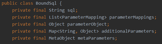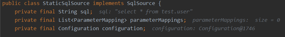 1 public class StaticSqlSource implements SqlSource { 2 private final String sql; 3 private final List<ParameterMapping> parameterMappings; 4 private final Configuration configuration; 5 ..... 6 }
