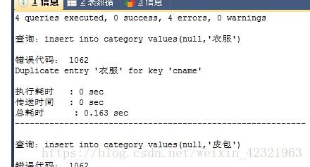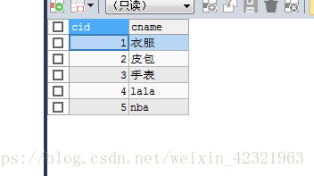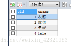 1 insert into category values(null,'衣服'); 2 insert into category values(null,'皮包'); 3 insert into category values(null,'手表'); 4 insert into category values(null,'lala');