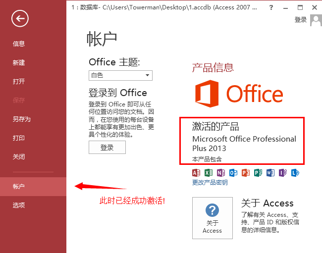4.按上面步骤激活好了之后,再打开任意一个Access文件,我们可以从账户里面看到此时提示的是“激活的产品”字样,说明已经成功激活可以安全使用了,如下图: