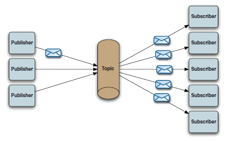 发布订阅模式的消息域使用topic作为Destination,发布者向topic发送消息,订阅者注册接收来自topic的消息。发送到topic的任何消息都将自动传递给所有订阅者。接收方式有同步和异步与P2P相同。