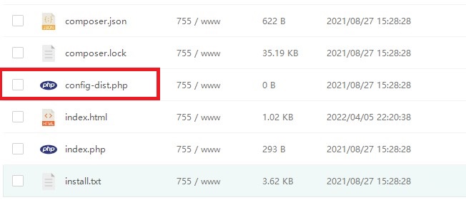 4、第一个奇葩来了,将网站目录下的/config-dist.php更名为config.php,/admin/config-dist.php更名为config.php。安装文件还需要改名,第一次见这么奇葩的操作。