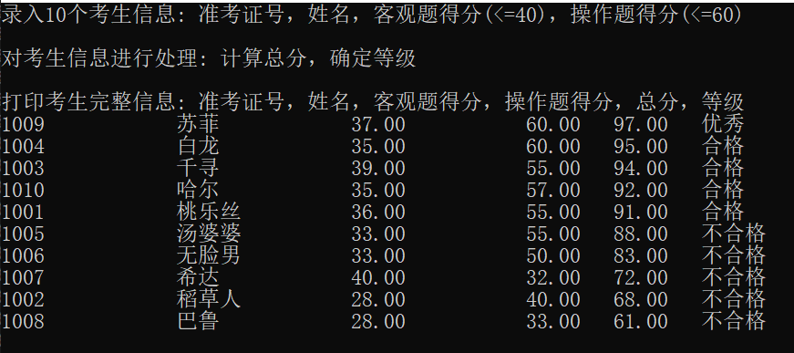 printf("\n打印考生完整信息: 准考证号,姓名,客观题得分,操作题得分,总分,等级\n");