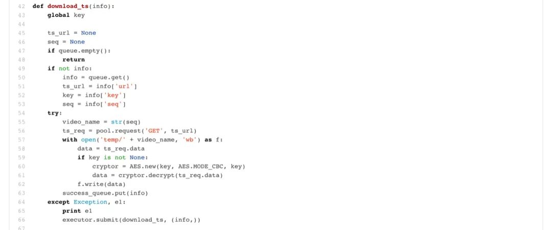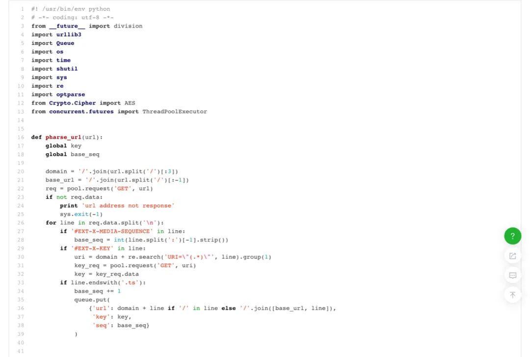 解析资源地址:使用python的urllib3内置库将m3u8文件请求到,结合re正则表达式内置库,解析出其中的加解密key、ts文件地址、视频顺序。并把信息推入队列queue供线程消费。